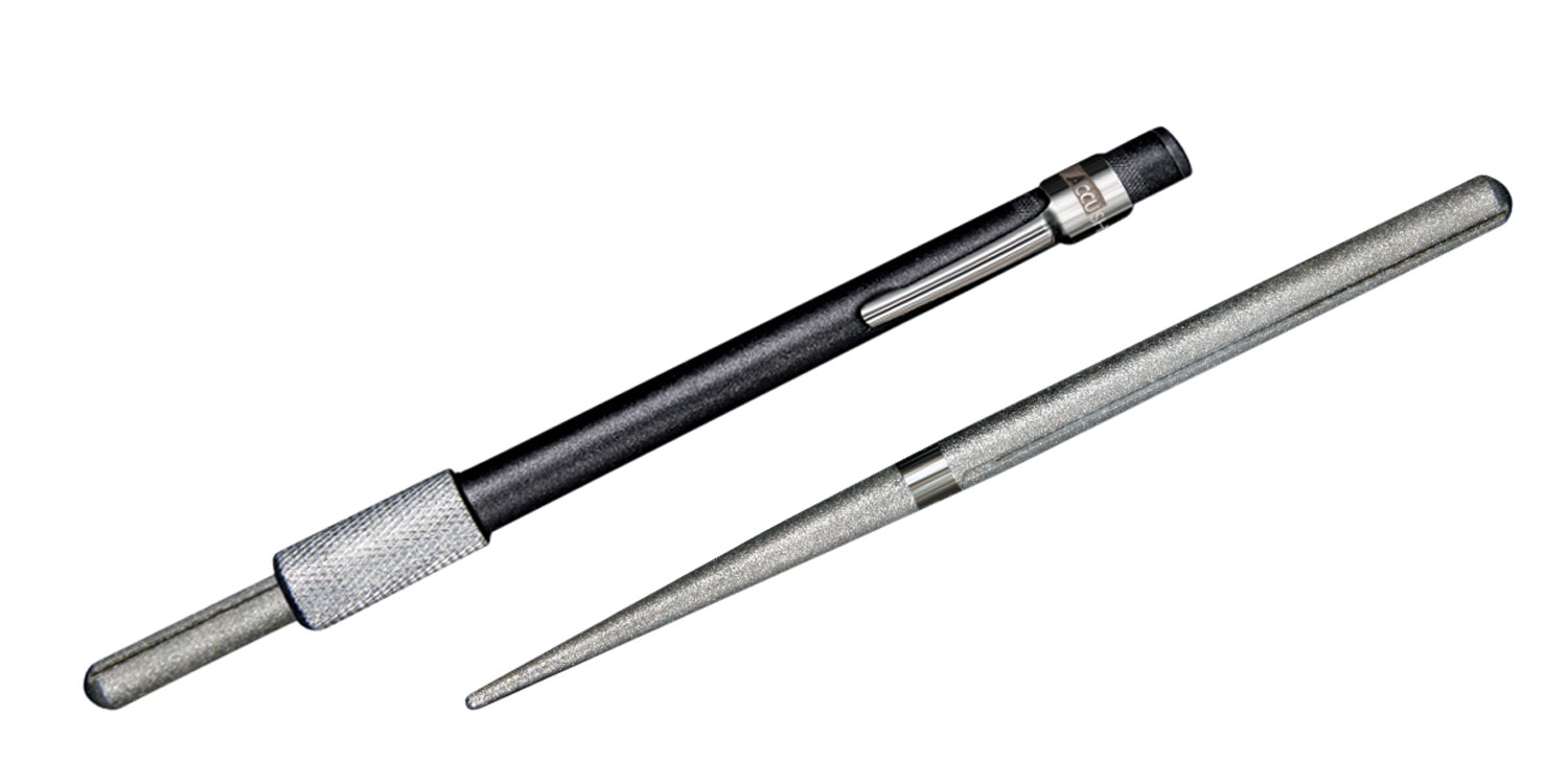 The AccuSharp Diamond Rod Sharpener is an unbreakable diamond-coated steel rod used to sharpen all kinds of knives, including serrated edges. The retractable rod is engineered with a cone-shaped end for use on serrations and tight spaces. The diamond-coated steel rod also has sharpening grooves for use with all kinds of hooks, darts and pointed objects and comes complete with a shirt pocket clip for easy storage. Grit Level- Diamond Rod 280. *Note- Product comes with one diamond coated rod. Image displayed shows both tapered and round rod for a visual representation.