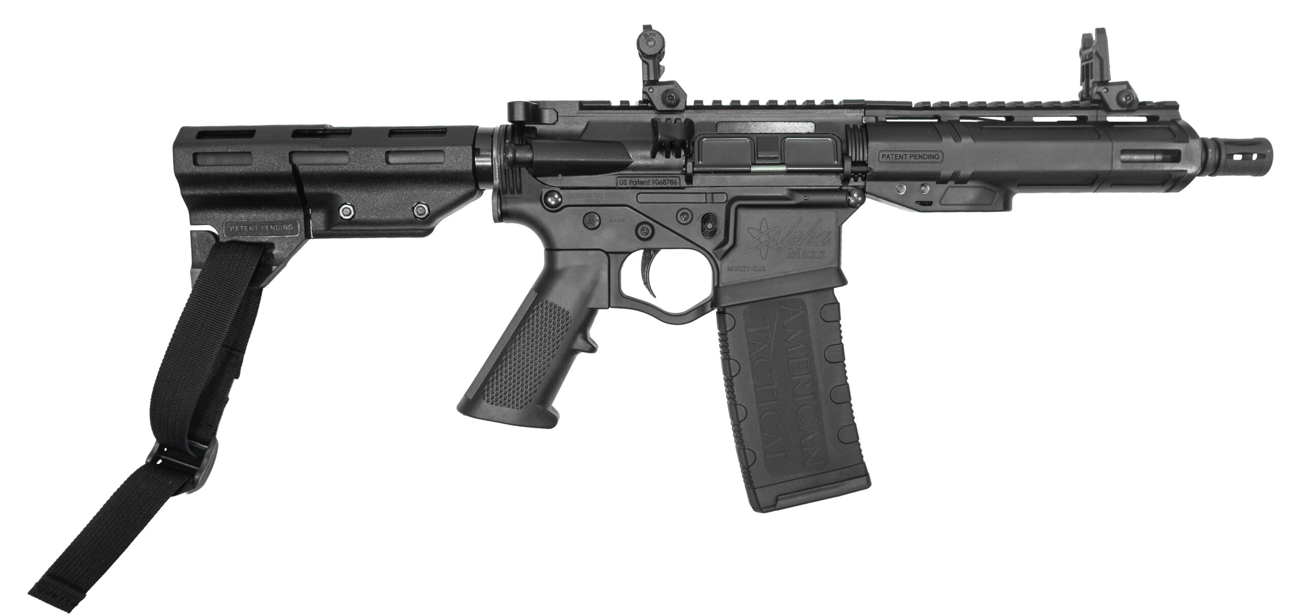 FAMILY: ALPHA-15 Series – MODEL: Alpha Maxx – TYPE: Semi-Auto Pistol – ITEM GROUP: AR Style Centerfire – ACTION: Semi-Auto – CALIBER/GAUGE: 223 Rem / 5.56 NATO – FINISH: POLYMER BLACK – STOCK/GRIPS: A2 Pistol Grip – BARREL: 7 – RATE-OF-TWIST: 1-in-8 – CAPACITY: 30+1 – # OF MAGAZINES: 1 – MAG DESCRIPTION: AMERICAN TACTICAL BRANDED 30 ROUND – SIGHTS: Flip Up Sights – SIGHT TYPE: Adjustable Sights – THREAD PATTERN: 1/2X28 – SPECIAL FEATURE: Threaded Barrel – WEIGHT: 6.95 lbs. – SHIPPING WEIGHT: 7.15 lbs. – SAFETY FEATURES: 2 Position Thumb Safety – RECEIVER: Polymer – ADDL INFO: Flat Top Receiver – ADDL INFO: 7 M-LOK Hand Guard POLYMER