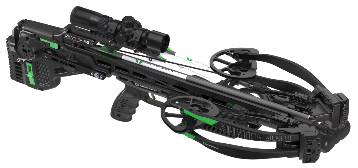 The Sinister 430D De-Cocking Crossbow is a 2025 new offering for CenterPoint Archery. – Features never seen before from CenterPoint include a fully integrated silent cocking system with an auto retracting cocking sled simple and smooth De-Cocking feature and a 1.5-5×32 mm adjustable speed dial illuminated scope. – The Sinister 430D w/ De-Cocking is fully adjustable from its bullpup stock foregrip string stops cheek comb and buttstock allowing you to tailor fit this bow to the user. With 164 foot-pounds of kinetic energy launching arrows at 430 FPS. the Sinister 430D provides an exceptional blend of speed power and maneuverability when hunting from a saddle stand or blind. An aluminum riser CNC machined cam system anti-dry fire technology and a roller retention spring provide outstanding repeatable accuracy and performance shot after shot. – De-Cocking smooth and simple way to decock your crossbow – Fully Integrated Silent Cocking System With Auto Retracting Sled Allows for a worry free cocking system – 1.5-5×32 Speed Ring Scope Dual Illuminated Reticle Speed ring adjustable for multiple FPS and precise aiming points to 100 yards – Fully Adjustable Bullpup Stock For length of pull and cheek alignment the Sinister is designed to fit archers of all sizes – 9 cocked / 13 Uncocked Width For easy handling while in a saddle stand or blind – Roller Arrow Retention SpringConsistent arrow tension for repeatable accuracy shot after shot – Full Accessory PackageIncludes a fully integrated silent crank system rail lube 1.5-5×32 mm illuminated scope and three (3) 20-inch .003 arrows and parallel quiver – SPECIFICATIONS – Arrow Velocity Up to 430 fps – Foot Pounds of Energy (FPE) 164 ft-lbs – Product Weight 9.3 lbs – Length 30 in – System Compound – Limbs Compression Fiberglass Quad Limbs – Stock Style Adjustable – Stock Material Composite
