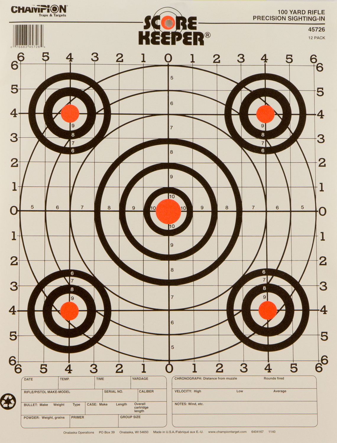This Scorekeeper features a “built-in” record-keeping section that lets you track vital data to refine your loads and zero-in on tight groups. Target is for sighting in your rifle in at 100 yds.