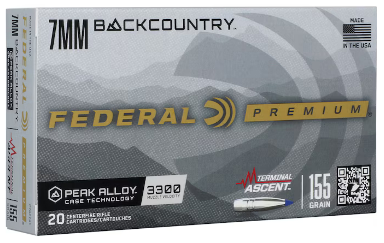 Any hunt. Any range. Go beyond what you ever thought possible with Federal Premium® Terminal Ascent Bonded construction penetrates deep on close targets while the patented Slipstream polymer tip initiates expansion at velocities 200 fps lower than comparable designs. The bullet’s long sleek profile offers an extremely high ballistic coefficient and its AccuChannel groove technology improves accuracy and minimizes drag. Available in a full selection of long-range hunting cartridges. – Match-grade long-range accuracy in a bonded hunting bullet – Extremely high ballistic coefficient – Exclusive Slipstream polymer tip helps flatten trajectories and initiate low-velocity expansion – Less wind drift and drop – AccuChannel groove technology minimizes drag – Copper shank and bonded lead core retain weight for deep penetration at any range – 155-grain 7mm Backcountry offering – Patented one-piece high-strength Peak Alloy steel case – Outperforms conventional brass-case ammunition – Optimized for shorter barrels to maximize velocity in compact or suppressed rifles – Increased magazine capacity over magnum cartridges – Specs – Caliber 7mm Backcountry – Grain Weight 155 – Bullet Style Terminal Ascent – Muzzle Velocity 3300 – Ballistic Coefficient .586 – Ballistic Coefficient G7 .300 – Package Quantity 20 – Usage Big Game
