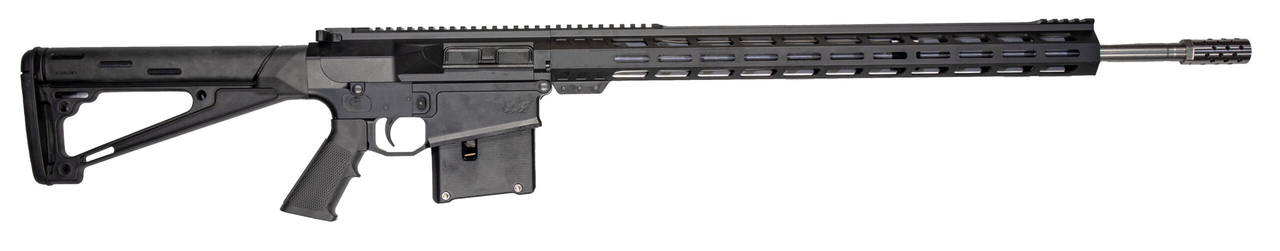 Barrel: 24 superior quality stainless steel (416R) with 5R rifling – Muzzle Brake: 5/8 x 24 stainless steel (416R) – Rifling: 1:8 Twist – Lower: Aluminum billet (7075) – Upper: Aluminum billet – Handguard: 20 Aluminum M-Lok upper picatinny rail – Gas Block: .750 4150 Steel Black Oxide Coated – Gas System: Rifle – Stock: Hogue fixed rifle stock black – Grip: Standard – BCG (Bolt Carrier Group): Custom design – Charging Handle: Custom design – AR-10 Compatible parts: Lower parts kits trigger safety – Magazine: GLFA custom aluminum 5 round black – Magazine has open witness window and tabs to pull down for easy loading