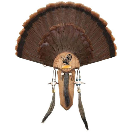 Proudly display your trophy gobbler. Includes natural oak finish plaque with laser engraved gobbler engravable brass name plate and antique brass cup hooks. Also comes with leather for spur mounts.