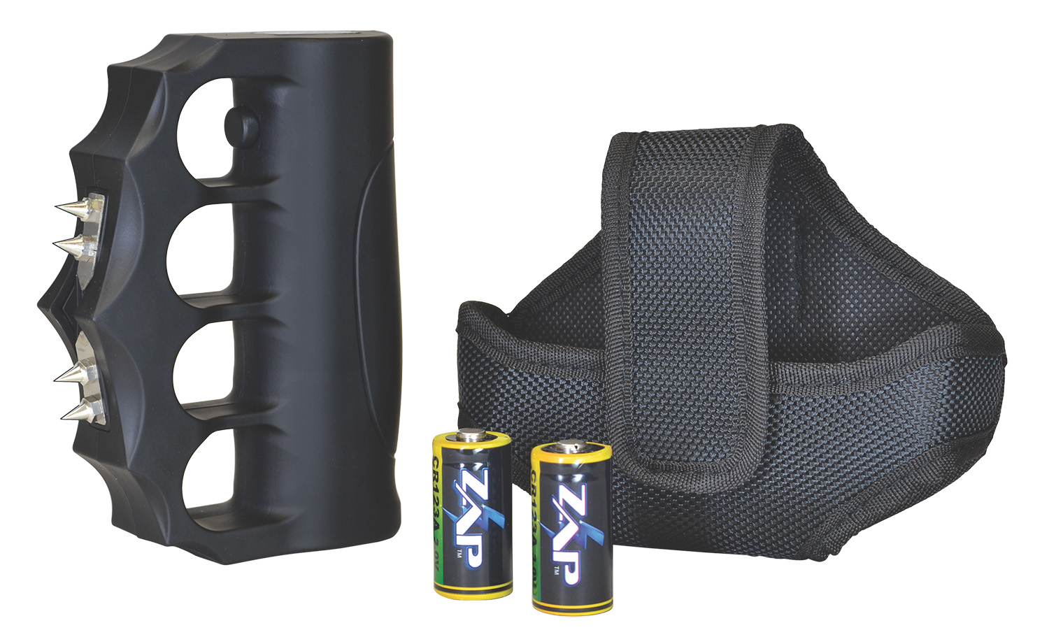 Perfect for joggers, the Zap Blast Knuckles Extreme features 4 ultra-sharp spike electrodes which offers extra protection and DNA collection for the authorities. It is rubber coated with soft contour grip for full control. It also has a red LED on/off indicator. Includes two (2) lithium CR123A batteries and heavy nylon case with belt clip.