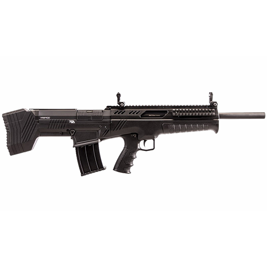 The VRBP-100 12ga shotgun offers ideal strength length and versatility all in one package. This 5+1 magazine fed semi-automatic bullpup shotgun comes equipped with a polymer stock directly behind the action making it as compact as possible without sacrificing firepower. Chambered for 2 ¾ and 3 shells with a durable anodized finish this gun is ideal for hunters and home defenders alike. – Gauge: 12 – Capacity: 5 + 1 (3 shells) Compatible w/ VR Series Mags – Weight Empty: 7.94 lbs – Weight Loaded: 8.82lbs – Overall Length: 32 (820mm) – Overall Width: 2 (51mm) – Overall Height: 7 (178mm) – Barrel: Contoured – Barrel Length: 20 (508mm) – Action: 3 (76mm) – Chamber: Semi-Auto – Choke: Mobil Choke – Finish: Matte Black – Stock: Polymer w/ Rubber Spacers to adjust LOP