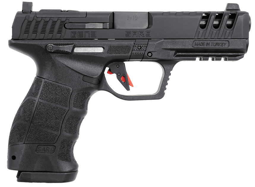 Possibly the most rigorously tested pistol ever developed the new SAR9 GEN3 endured 150000 rounds of live fire at the factory. The polymer framed striker fired SAR9 GEN3 points naturally and is a pleasure to shoot. With a choice of three interchangeable back straps to customize fit and 20 degree grip angle providing superior control. – Available in a number of different configurations including some models having mounting screw holes for direct installation of a micro reflex sight. – Features – Polymer Frame – Forged Steel Barrel & Slide – Interchangeable Grip Panels – Manual Safety – Striker Status Indicator – Picatinny Accessory Rail