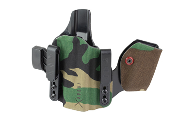An ergonomic, mission-adjustable, RDS-compatible, multi-positional, deep concealment IWB hybrid thermoplastic holster. Its distinctive features enable concealed carry for a wide range of handgun fits from various carry positions while allowing a full firing grip prior to drawing. The design includes passive retention and adjustable tension, enabling a finely tuned fit and smooth draw. This evolution of the IncogX features a series of clips that provide more adaptability to the user while maintaining the original goals of improved grip, concealment, and function. The clips open outward and slide down with the holster, naturally locking over the belt. An actuated finger tab flexes to open, allowing quick installation or removal from the belt. An improved clip strut design combines functionality with customized concealment shims that can be easily installed or removed without tools. All IncogX models come with clip strut shims in three different concealment sizes: 1/8″, 1/4″, and 3/8″.