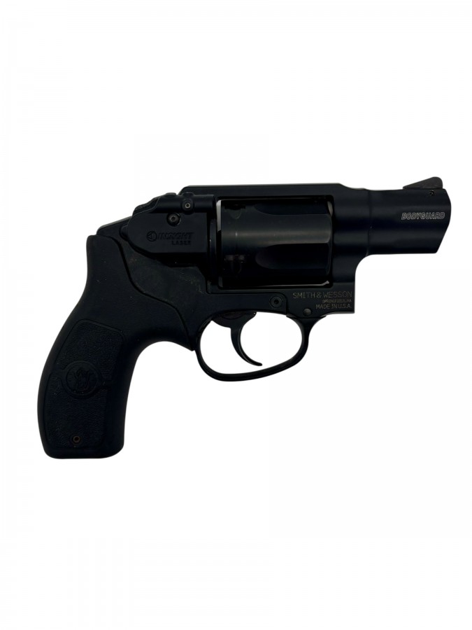USED S&W BODYGUARD .38 SPECIAL REVOLVER. IT FEATURES THE INSIGHT LASER (DIM, BUT WORKS) 5 SHOT CYLINDER, DOUBLE ACTION ONLY TRIGGER, COMPLETELY ENCLOSED HAMMER. GUN IS IN VERY GOOD CONDITION WITH JUST A COUPLE OF SMALL NICKS.