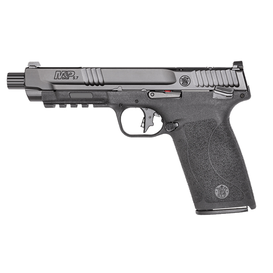 The New M&P 5.7 will light up the range and quicken your pulse. With its rotating 5 Tempo Barrel System the new M&P 5.7 utilizes the ballistics of the 5.7 x 28 round in tandem with the repeatability of the Tempo System. Get worry-free consistency in a 22+1 handgun. Take control and feel the fast. – Internal hammer-fired gas-operated locked-breech TEMPO barrel system (barrel doesn’t cam open until bullet passes gas port). – Slim optimally textured grip. – Ambidextrous slide stop and Manual Thumb Safety. – Reversible magazine release. – Slide cut for optics. – Flat-face trigger for consistent finger placement allows for more accurate and repeatable shooting. – Picatinny-style rail. – Forward slide serrations. – Crisp single-action trigger break. – Accurate 1 in 9 twist barrel. – Comes with two 22-round magazines. – Made in U.S.A – Specs – CALIBER 5.7X28 – SIZE FULL – CAPACITY 22 – ACTION INTERNAL HAMMER FIRED – BARREL LENGTH 5 – GRIP POLYMER – SIGHTS WHITE DOT – OPTIC READY YES – SAFETY THUMB SAFETY – COLOR/FINISH BLACK – THREADED BARREL YES – FRAME POLYMER – NUMBER OF MAGAZINES 2
