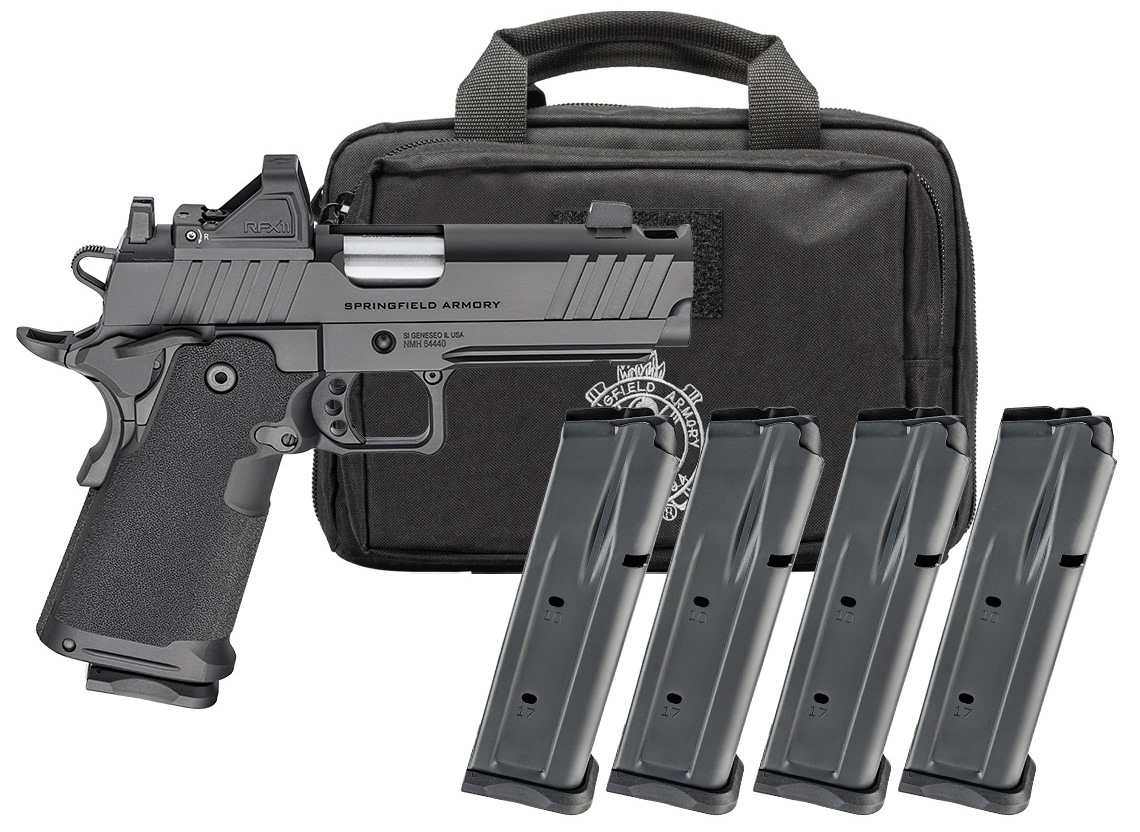 The Prodigy Comp from Springfield Armory® takes the proven 1911 platform and enhances it with double-stack capacity and a performance-driven feature set. Reconfigured around a double-stack magazine the polymer grip module mounts to a forged steel frame offering capacities of 17+1 and 20+1. The AOS-compatible slide and barrel assembly is integrally compensated to reduce muzzle rise while a Picatinny rail is ready to accept today’s most popular accessories. The Prodigy Comp combines the most beloved characteristics of the 1911 with modern capacity for unrivaled performance. – Caliber 9mm – Color Black – Barrel 5 Forged Stainless Steel Match Grade Bull 1:16 – Slide Forged Carbon Steel Black Cerakote® Optics-Ready Integral Compensator – Frame Forged Carbon Steel Black Cerakote® – Sights White-Dot Front Black Serrated Rear Viridian®RFX11 Green Dot – Recoil System 2 Piece Full Length Guide Rod – Grips Polymer – Magazines (3) 17-Round (1) 20-Round – Weight 33 oz – Length 8.5 – Height 5.5