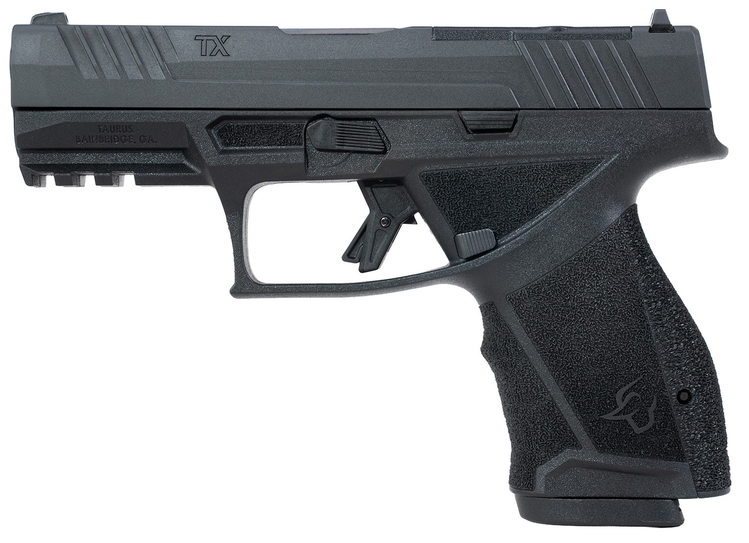 Duty Ready. That phrase defines the philosophy driving the TaurusTX9. The TaurusTX9 is designed from the ground up for the toughest environments and maximum performance. – Featuring the Taurus Modular System; a serialized modular chassis that enables users to quickly swap frame sizes between the full size compact and subcompact. An ambidextrous slide release pairs with the reversible magazine catch accommodating both left- and right-handed shooters. The TaurusTX9 uses industry standard dovetails for its iron sights readily accepting many aftermarket options. The TaurusTX9 is Also optics-ready right out of the box utilizing the existing Taurus T.O.R.O. System. The compact frame TaurusTX9 has a 4.0 inch barrel and 15+1 capacity. 4 interchangeable backstraps enable additional customization so shooters can properly fit the gun to their hands. – No matter your mission personal protection law enforcement home defense competition shooting the TaurusTX9 is Duty Ready. – The Basics – Caliber 9mm Luger – Front Sight Removable White Dot – Magazines Included 2 – Capacity 15 Rounds – Rear Sight Drift Adjustable – Action Type SAO – Special Features Striker-Fired Trigger Modular Grip Taurus Modular System Optics Ready – Tech Specs – Frame Size Compact – Overall Height 4.8 In. – Overall Width 1.28 In. – Twist Rate 1:16.5in RH – Barrel Length 4.0 In. – Overall Length 7.19 In. – Overall Weight 23.7 Oz. (Unloaded) – Materials – Frame Material Stainless Steel – Slide Material Alloy Steel – Barrel Finish Matte Black – Frame Finish Stainless – Slide Finish Gas Nitride – Barrel Material Alloy Steel – Safety Firing Pin Block Trigger Safety