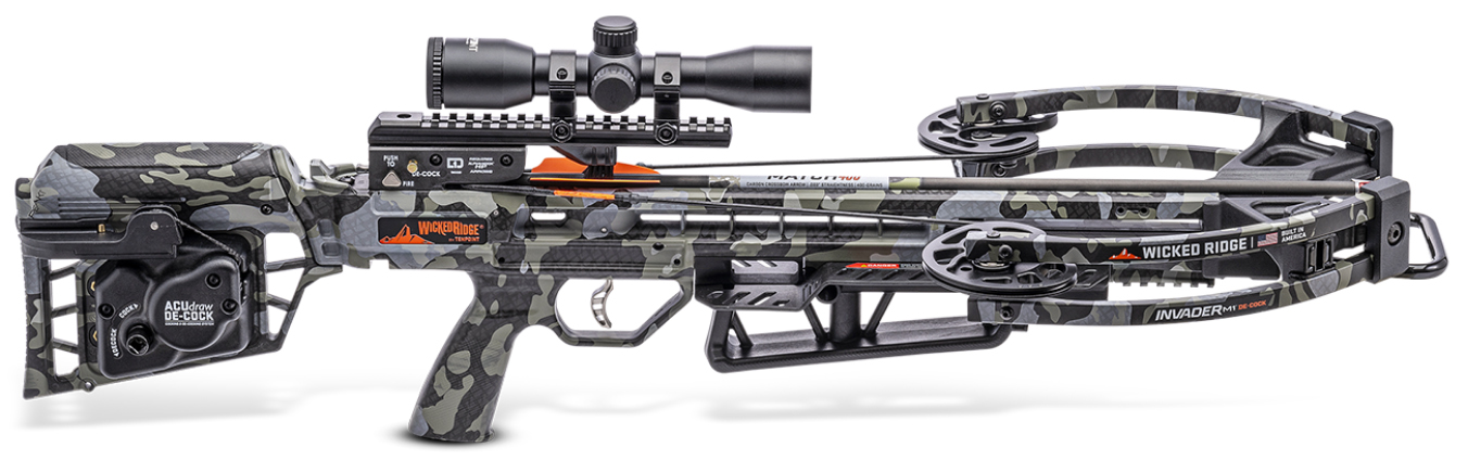 Wicked Ridge’s All-Time Best-Selling Light Crossbow and Budget Crossbow Now De-Cocks Introducing the Invader M1 De-Cock. – Shooting 390 feet-per-second the American-Built Invader M1 De-Cock is an affordable de-cocking crossbow and value crossbow that features the ACUdraw or ACUdraw 50 SLED De-Cock and brings compact de-cocking to a lower price than ever. – Gone are the days of carrying a target or shooting a discharge arrow after the hunt! – If you don’t take a shot push the de-cock button and safely de-cock the light crossbow with the built-in ACUdraw De-Cock or manually de-cock the crossbow with the ACUdraw 50 SLED De-Cock. – Once you experience the convenience of de-cocking you’ll never return to a non-de-cocking American crossbow. – Features & Benefits – Built-In ACUdraw De-Cock Cocking & De-Cocking System: Provides silent cocking and safe de-cocking. (note: also available with ACUdraw 50 SLED for manual de-cocking). – Lightweight Affordable De-Cocking Crossbow at8-pounds and Compact Profile: More mobility and more shot opportunities by reducing the chance for cam/limb contact in the stand or blind. – 70-yard Pro-View 400 Lighted Scope: Offers aimpoints out to 70-yards and features an updated reticle for a cleaner view and greater down-range accuracy. – Pre-Sighted at 20-yards: Pre-sighted by American workers before leaving the factory to ensure your success. – Built in America: An American crossbow inspected built and tested by American workers to guarantee craftsmanship you can depend on. – Package Includes: – Built-In ACUdraw De-Cock or ACUdraw 50 SLED De-Cock – 70-yard Pro-View 400 Lighted Scope – 3 Match 400 Carbon Arrows – Quiver